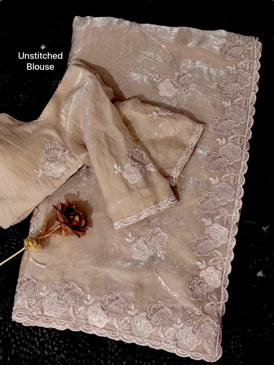 *A perfect partywear beauty, Grace meets glamour in this ethereal dusty beige colored saree adorned with exquisite beads embroidery with sequins work. Perfect for any celebration.*