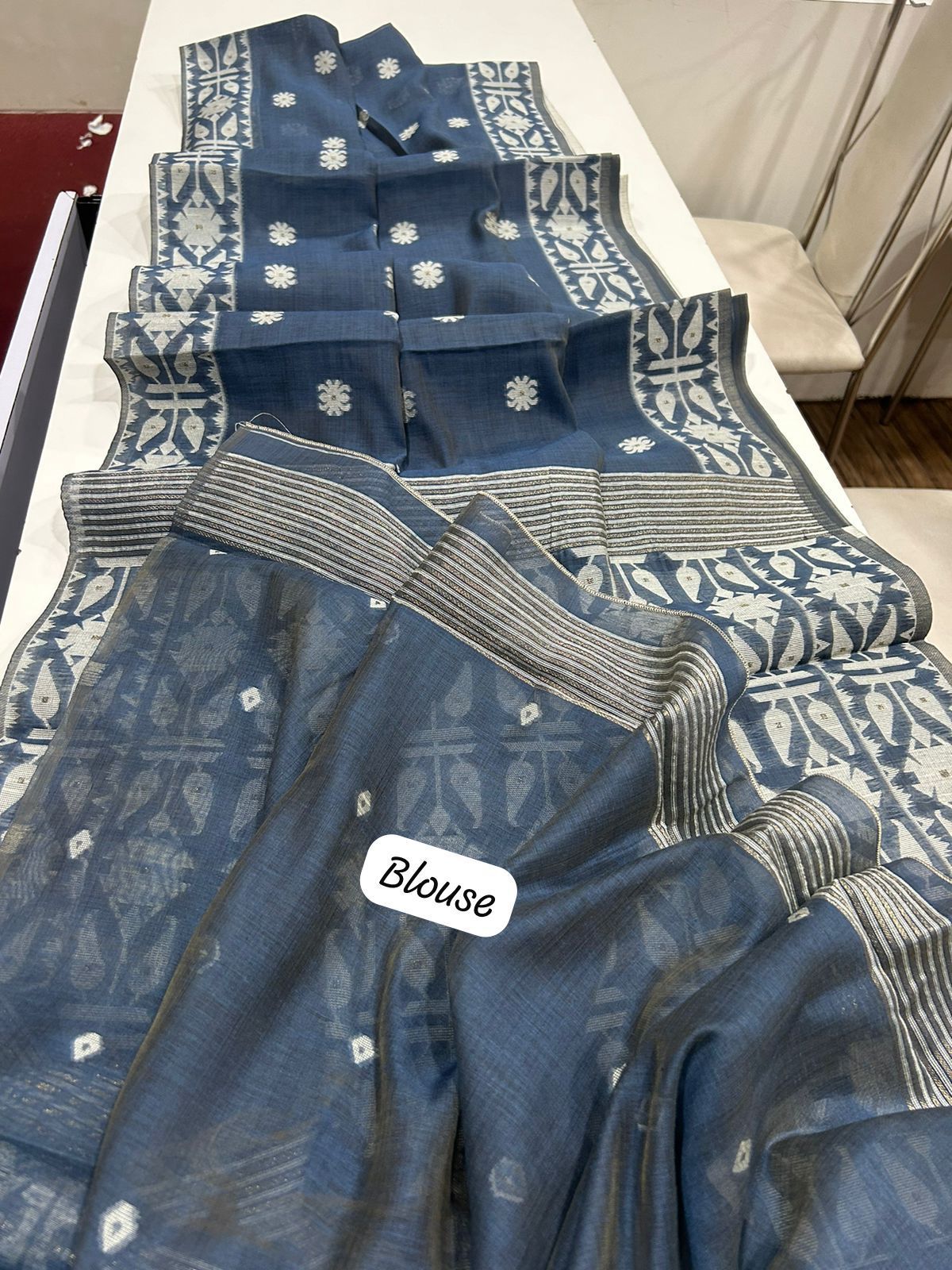 Premium soft muga Cotton saree in jamdani concept with contrast weaving border and all over small weaving butties with running blouse piece