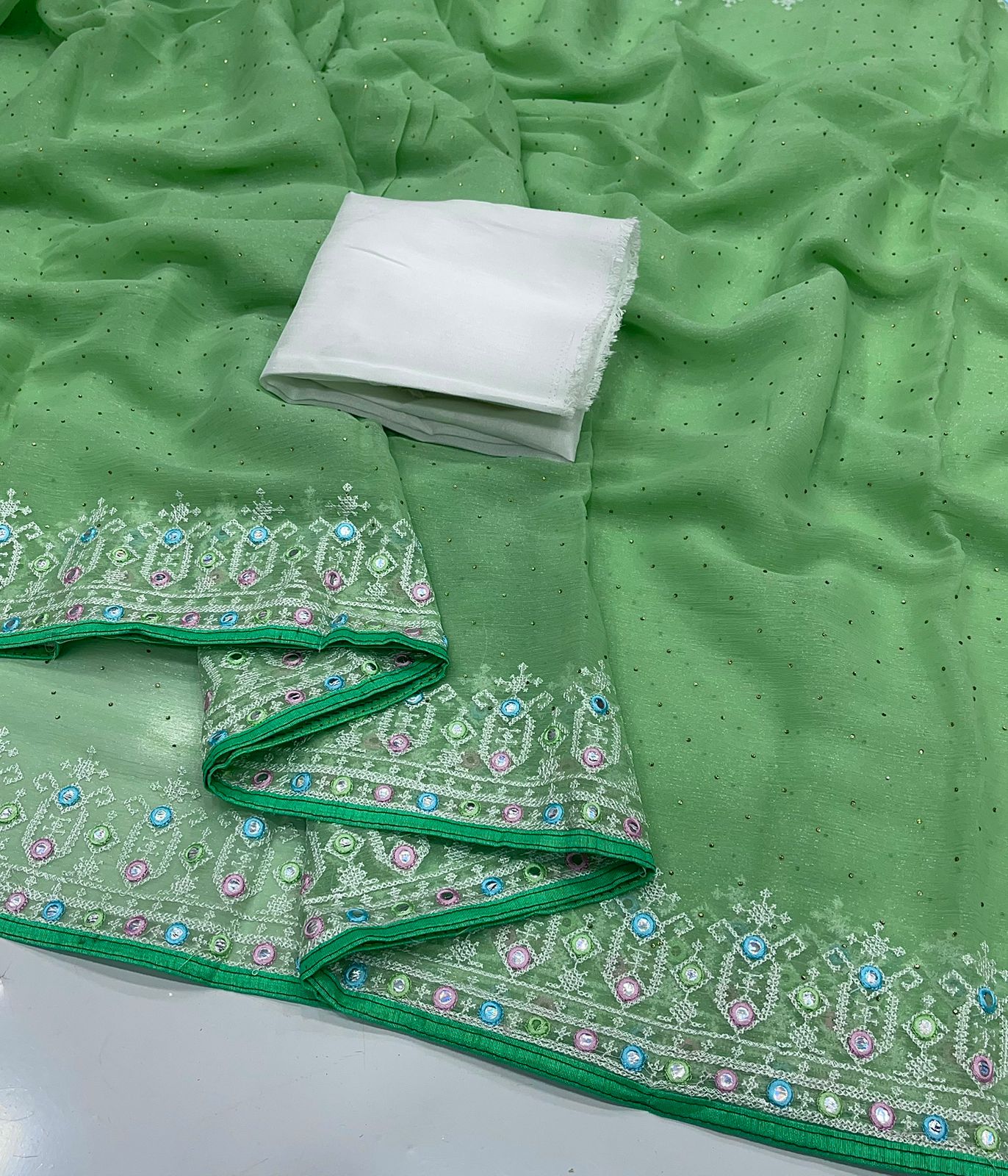 Star georgette saree with embroidery work and mirror work all over saree with beautiful work With Blouse